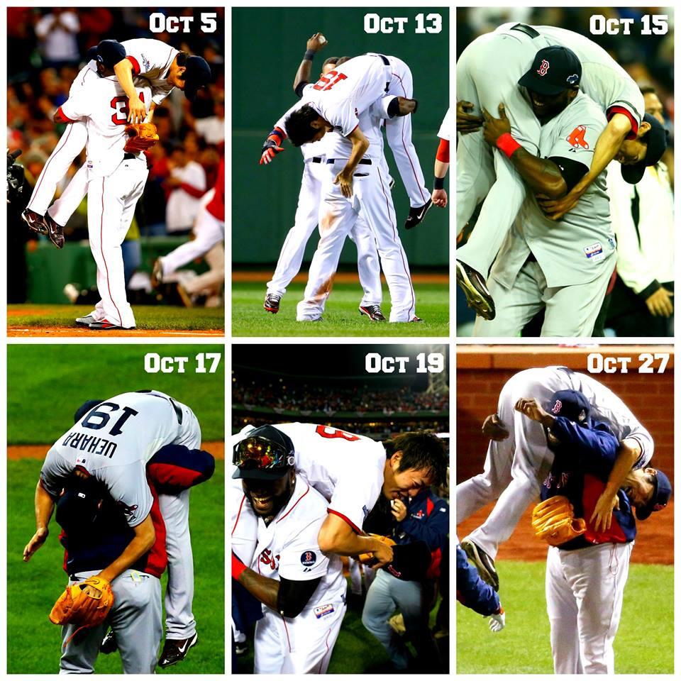 Winning it all in 2013 was so different from '04 and '07. In '04 and '07, there was that desperation to win and vanquish overwhelming enemies and prove something. In 2013, this team got me through some tough times and I'm grateful to them. I was less elated when they won tonight but got much more into the everyday rhythms of this 2013 team: the way Nava (cut from his college team) would take a close pitch outside for a ball and then slam the next strike for a line drive; the way Victorino would fly into the right field corner to save a double; Uehara's magic splitter and the sheer joy of his high-fives; Pedroia's slide onto one knee to stop a ball that seemed destined for right field; Miller throwing the ball unbelievably hard; and Napoli going to a 3-2 count every single time. We got to watch a new teammate step up each time we needed someone new to deliver and count on each other and, to use their favorite word, "grind." This team never gave up and came from behind more times than I could count. I was much more involved in the journey than the destination this time and it was beautiful to believe in the magic of baseball (tough to do after 2012) and to let baseball carry me through the pain and weariness of recovery from surgery. Most of all, there was Ortiz, father figure to the whole team, telling us, "Nobody is gonna dictate our freedom" when we needed to hear it. I would have loved the 2013 Red Sox if they hadn't won the World Series or even the ALCS or even the ALDS. They are a special group of guys. But of course, they did win, by coming from behind over and over, even when I counted them out, even when an umpire made one of the most infuriating calls of all time. They were able to let that go and move on and take it one pitch at a time. Winning in 2004 and 2007 was pure joy and elation and relief. But winning in 2013 has felt much different, much more like gratitude for how they carried those of us who believe in this stuff through. Thanks, gents.